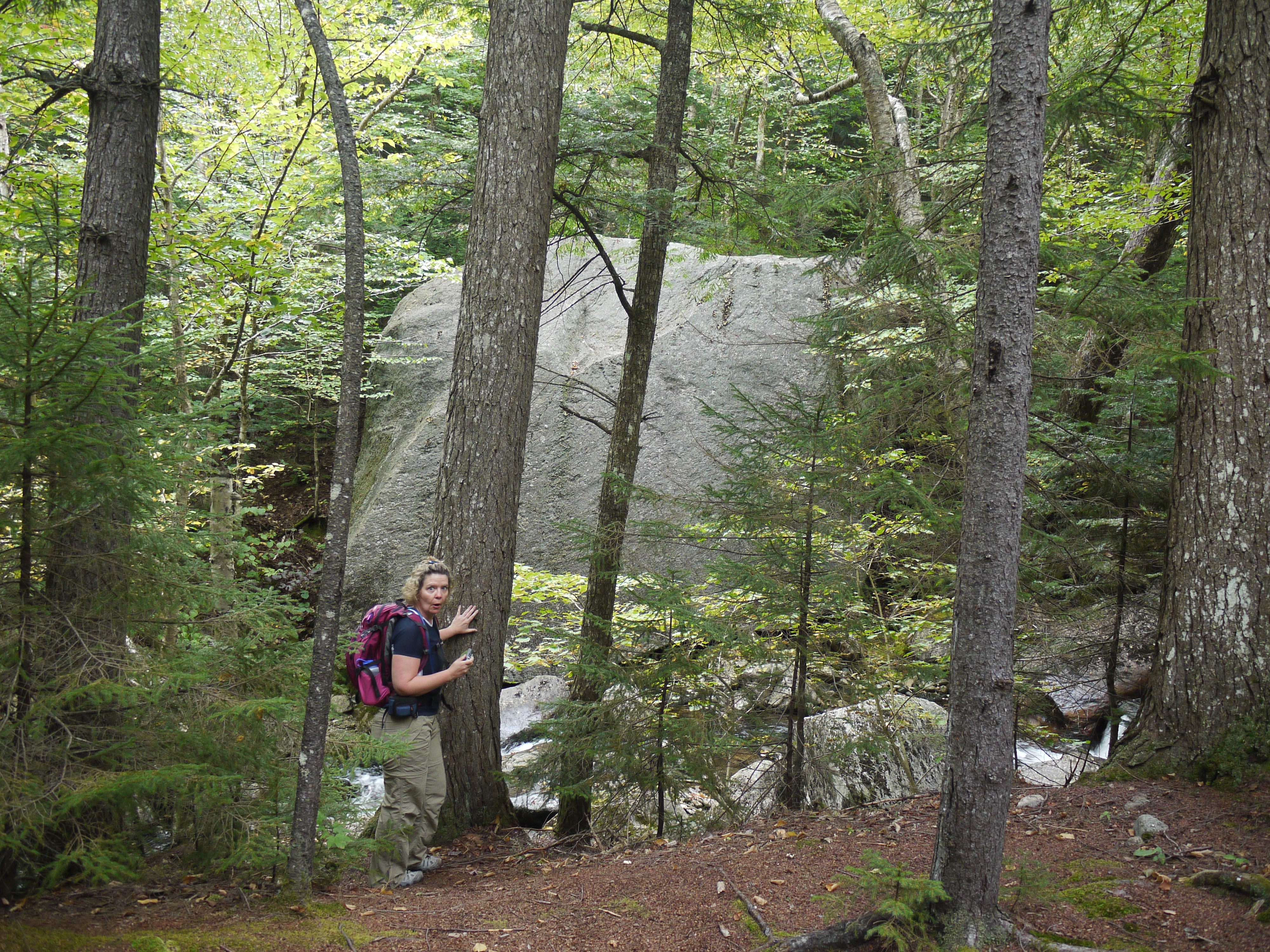 At .9 miles we hit an intersection of trails. We continued on Brookside for a smidge. On the other side of Snyder brook, I noticed there THE largest boulder.