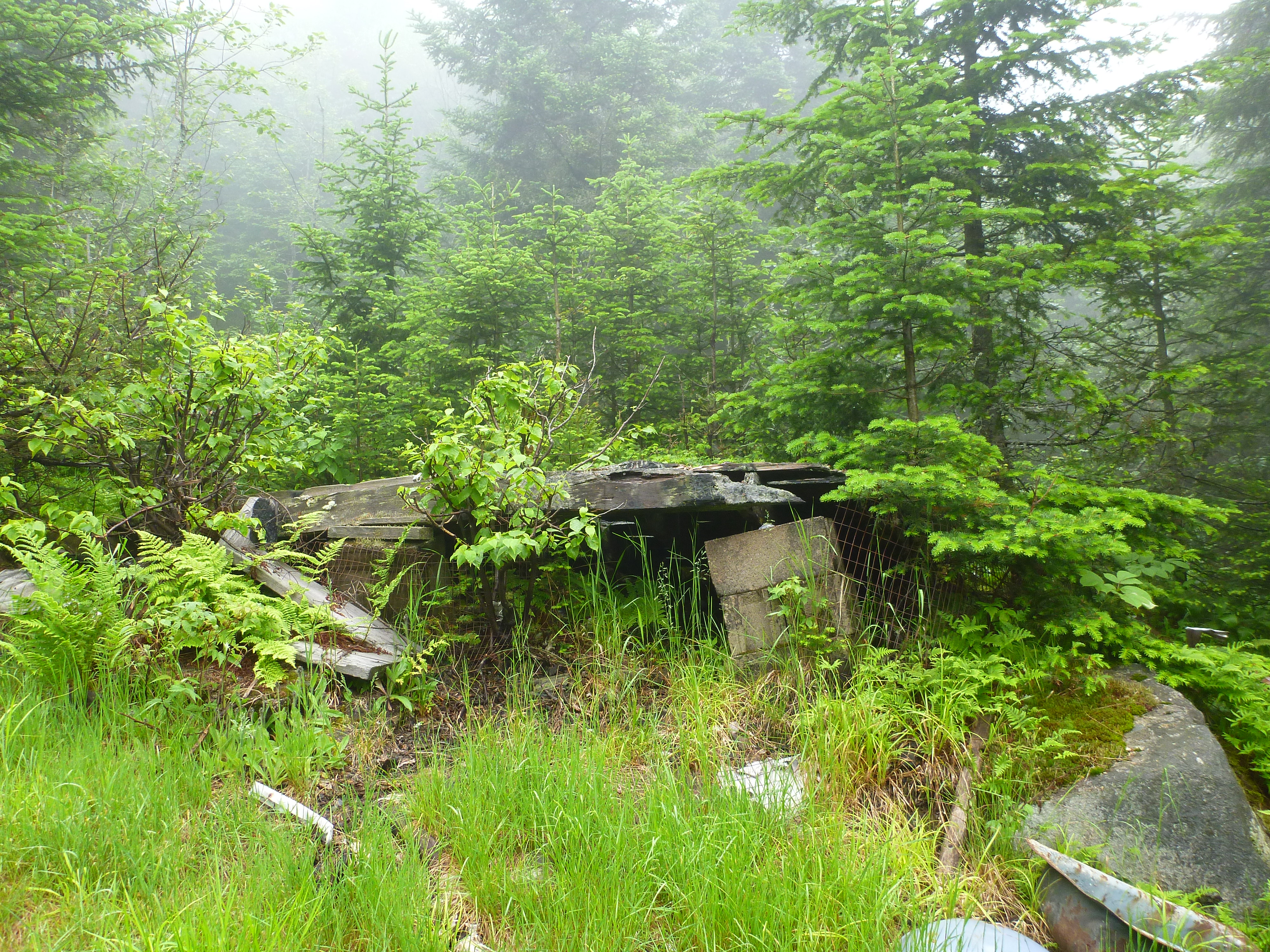 At 1.5 miles we reached the old fire warden’s hut, that is now a jumbled mess of wood and tin.