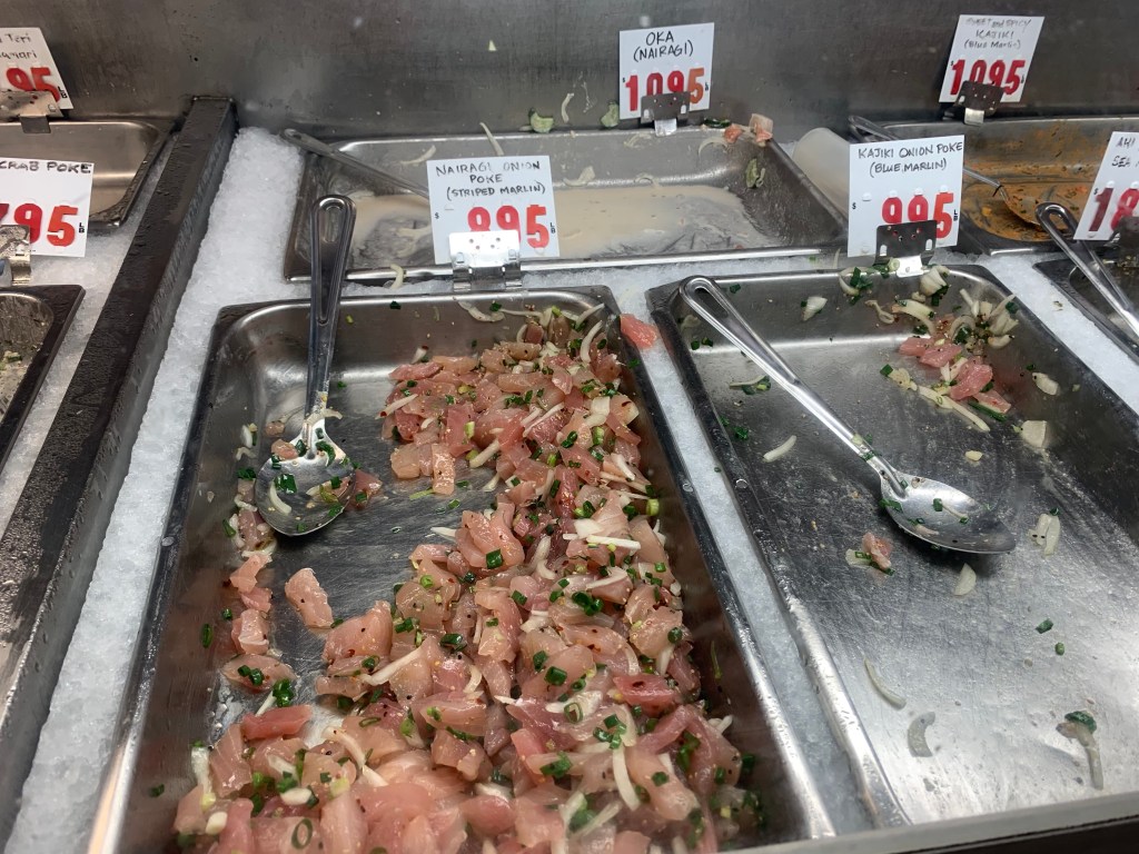 We had one last stop to make before returning to the house, Tamashiro Market for poke. This is truly a local’s spot, but it is the only place I can have Marlin poke. In August, on our last trip, Marlin wasn’t in season, so there was none available. Today three different types were and I think I hyperventilated when I saw the options.