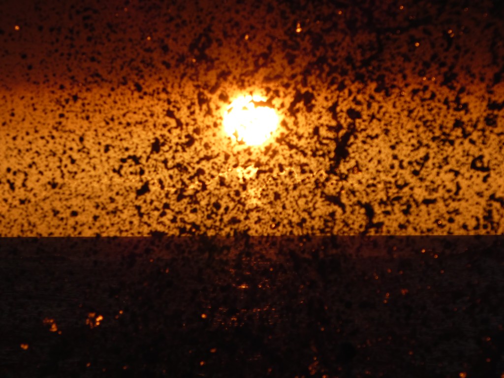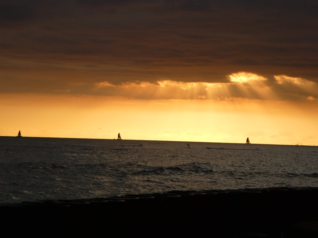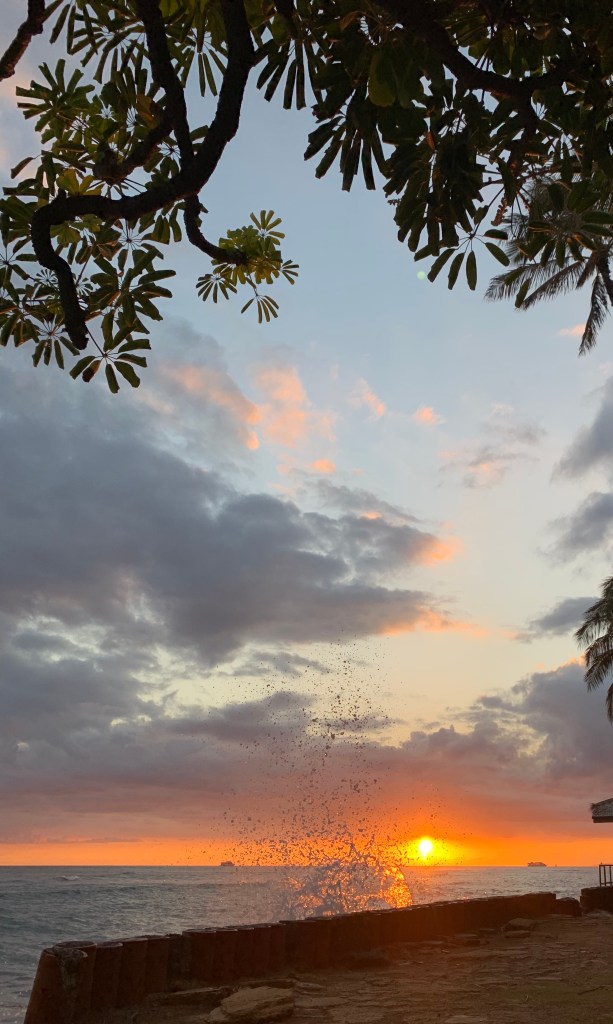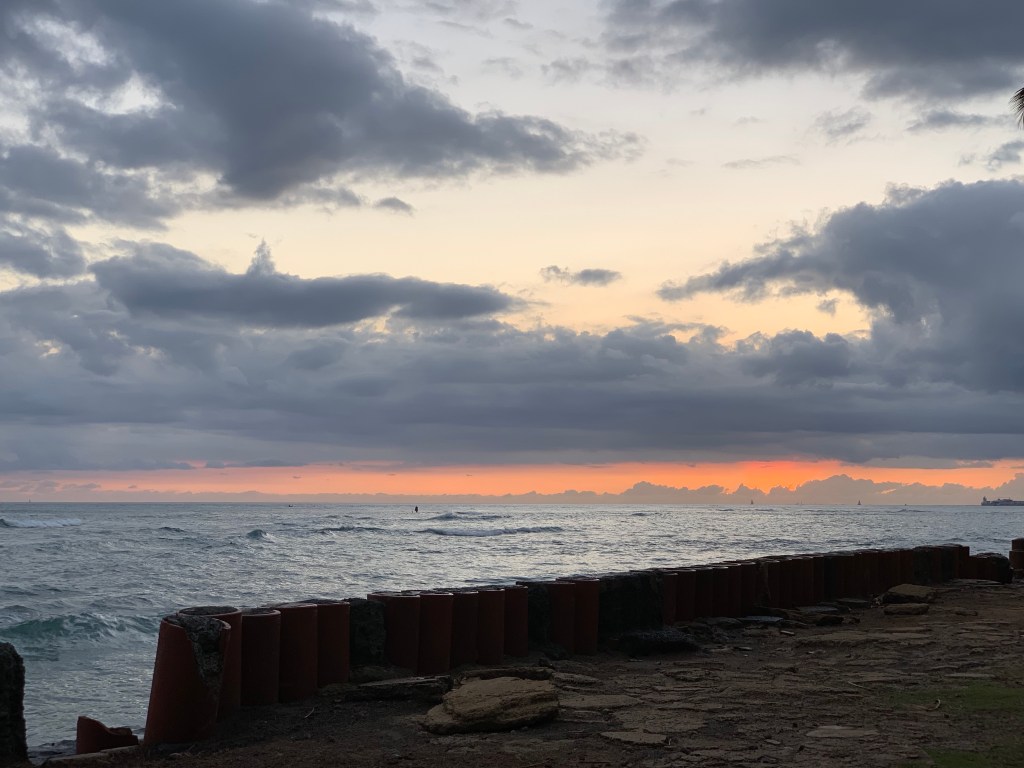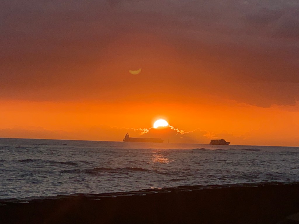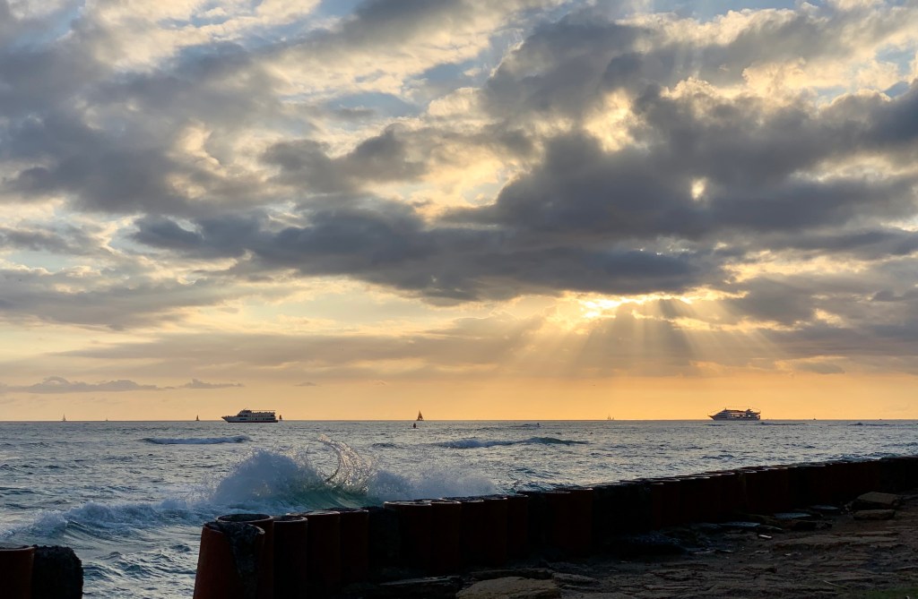 Once again we returned to the house and gathered up dinner goodies and sunset viewing materials. We walked over to Leahi Beach Park to dine and watch the sunset. What was for dinner? Poke and crackers. Tonight my “ghost ship” didn’t block the view of the sunset, at least not from our angle. The only blocking was by a low cloud, still a beautiful sunset.
