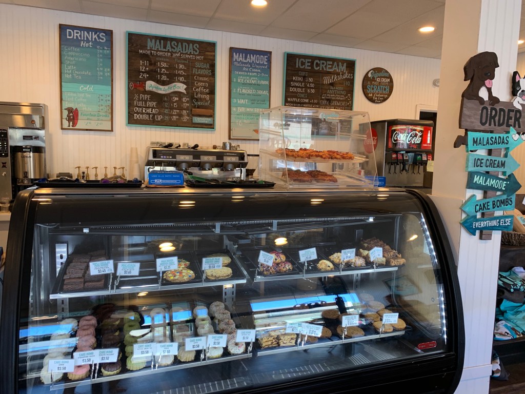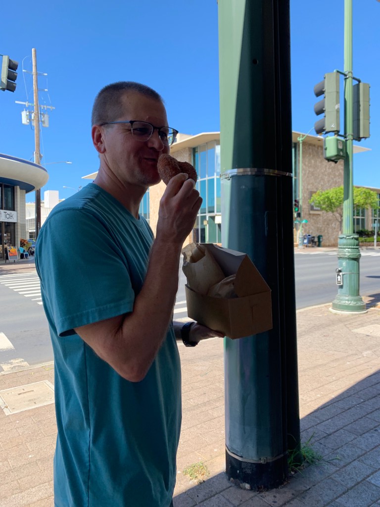 Next stop, a farmers market in Manoa. We discovered this one at the end of our last trip, which was to bad we hadn’t in the beginning of the trip. It’s not touristy and full of fresh veggies and fruits. We picked up our items, then stopped at Safeway for the remaining foodstuff. Our fog from yesterday had lifted so grocery shopping was easier. We had one last destination before home, Pipeline Bakery for scones and malasadas. The bakery items here are to die for.