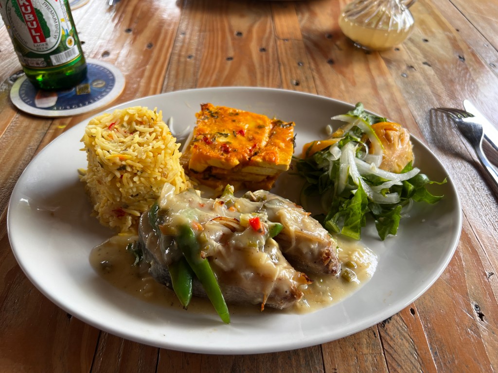 Mike had the stewed octopus and I had the mahi-mahi in creole sauce. Dessert was West Indies Pudding. The meal was outstanding.