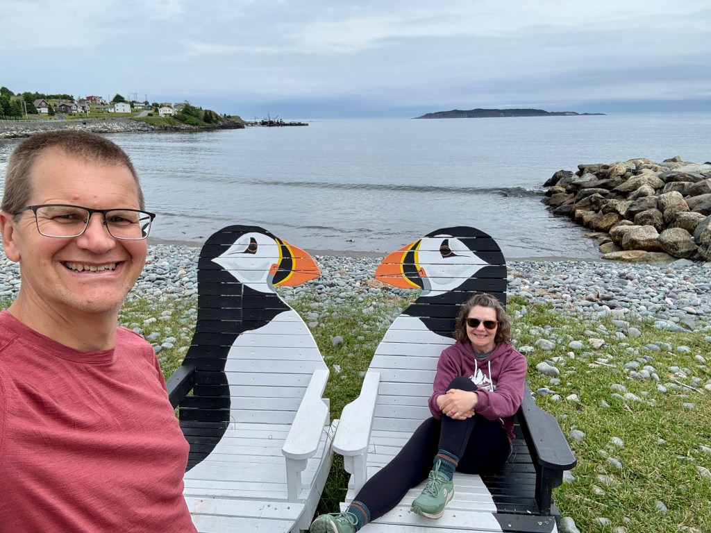 Our route to the new lakeside rental took us to puffin chairs. Of course we had to sit in them! Or sat, Mike stood.