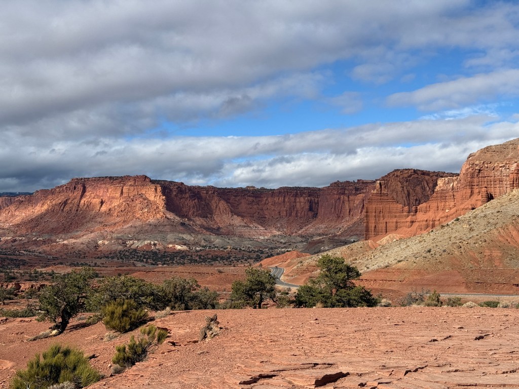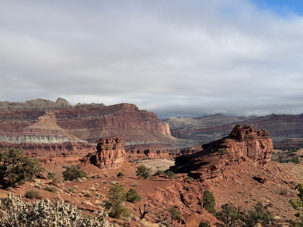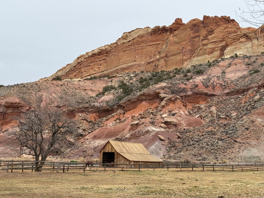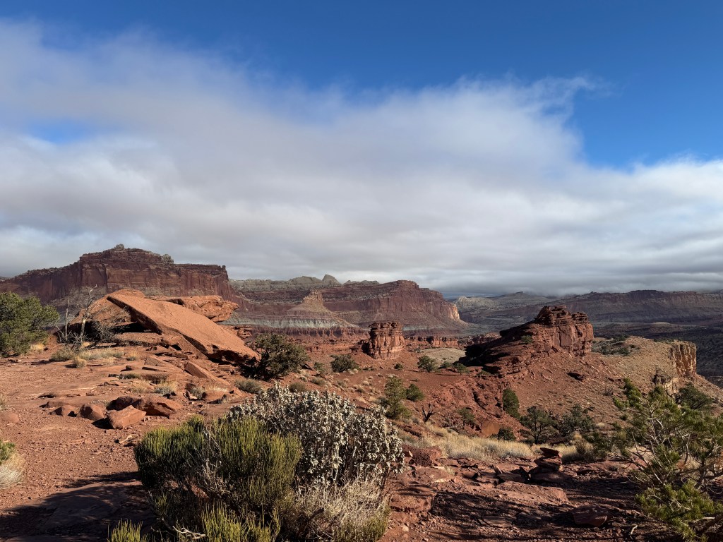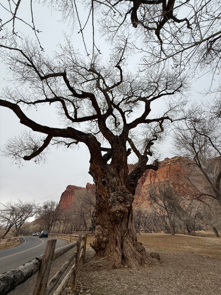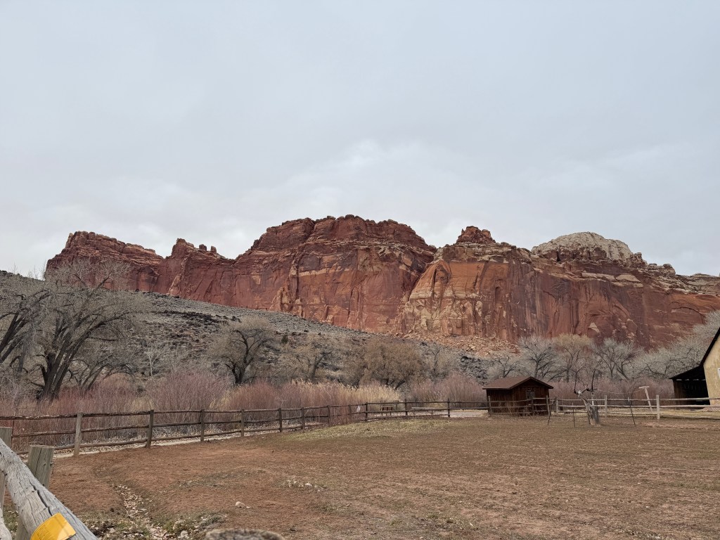Happy New Year. We woke to rain and slush in Canyonlands. We wanted to hike to Mesa Arch on our way out, but it was not to be. Today was our move day to Capitol Reef where the sun was out.