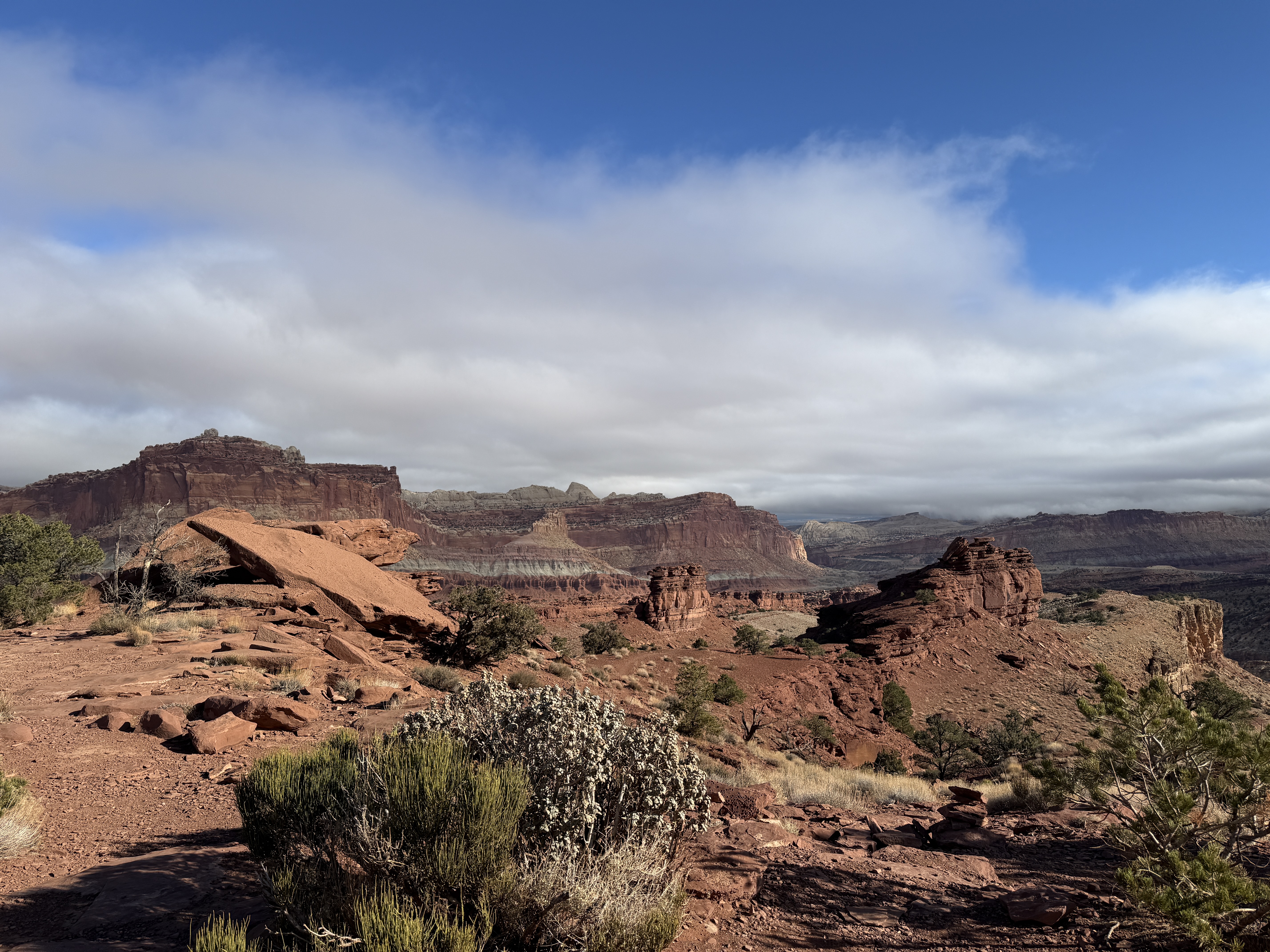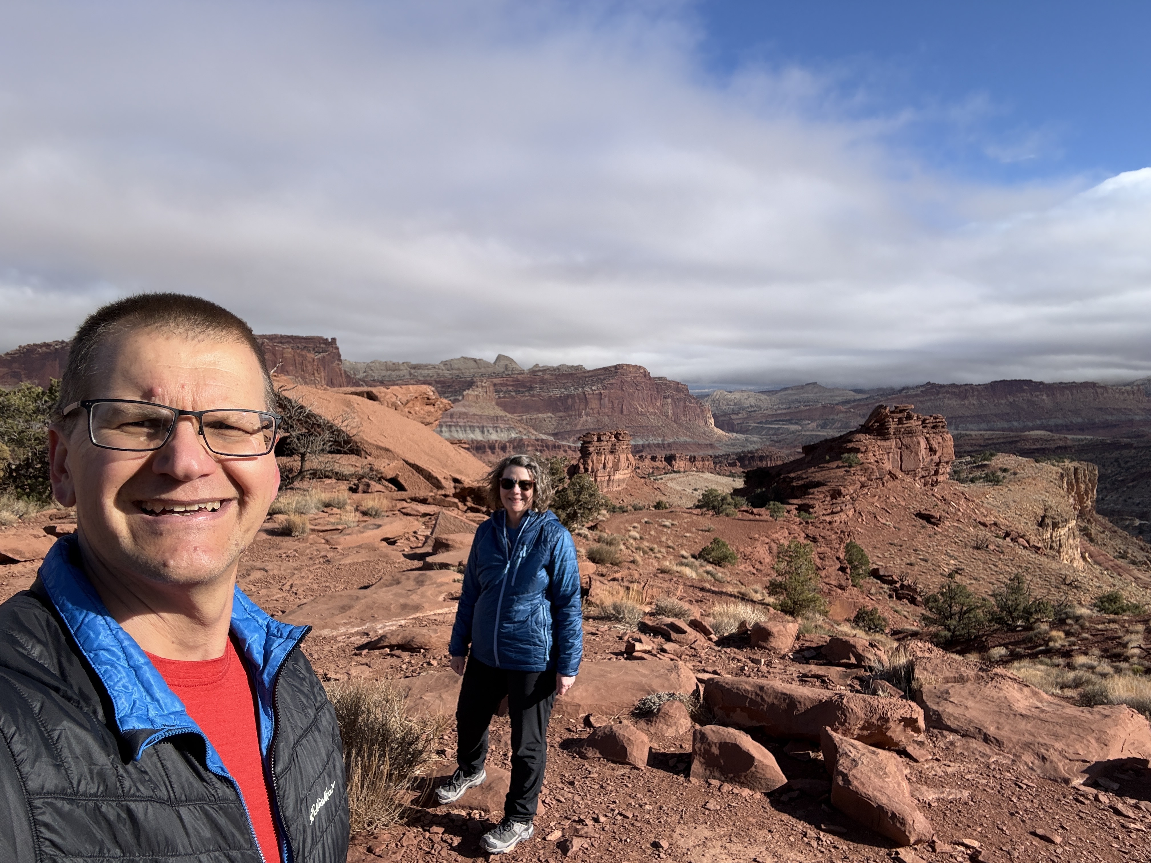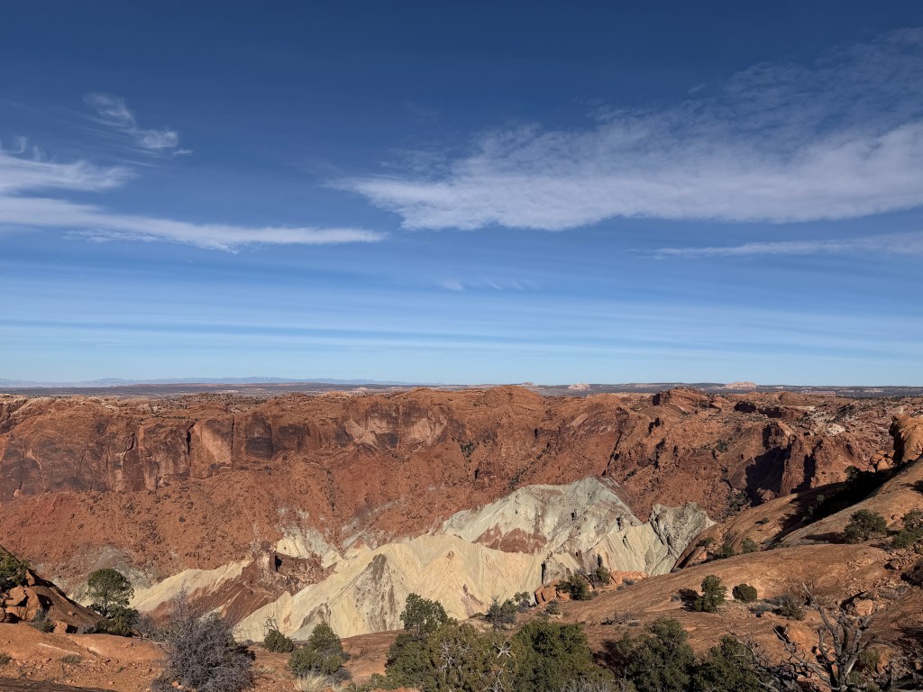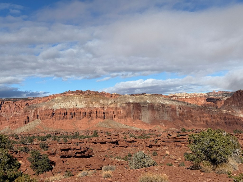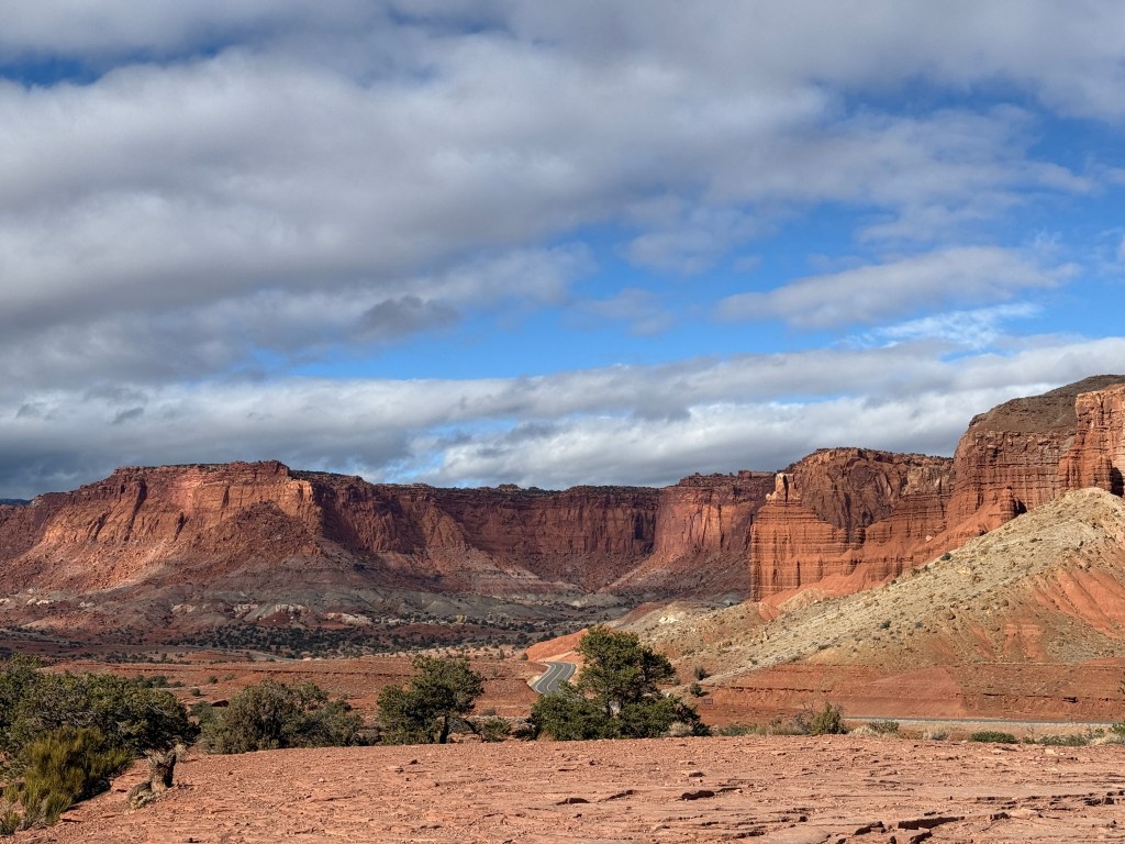 Happy New Year. We woke to rain and slush in Canyonlands. We wanted to hike to Mesa Arch on our way out, but it was not to be. Today was our move day to Capitol Reef where the sun was out.