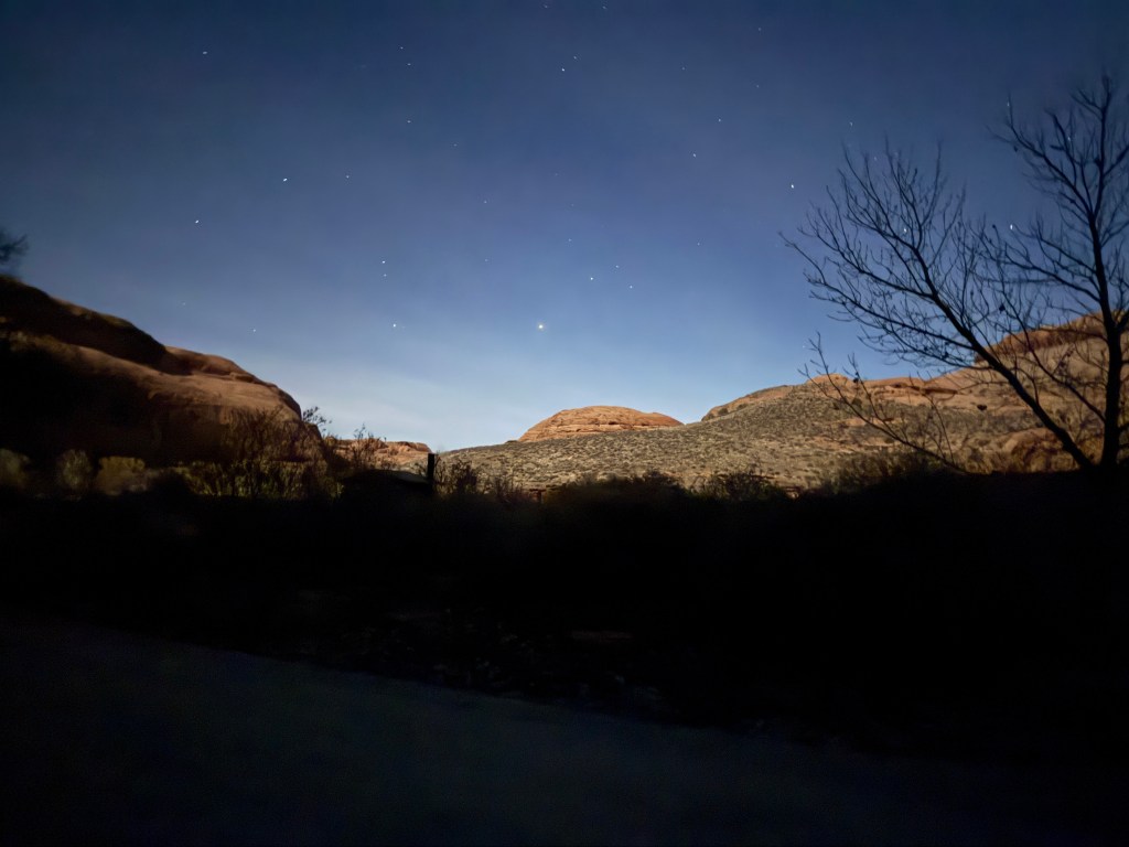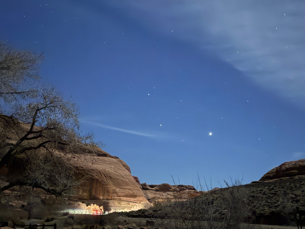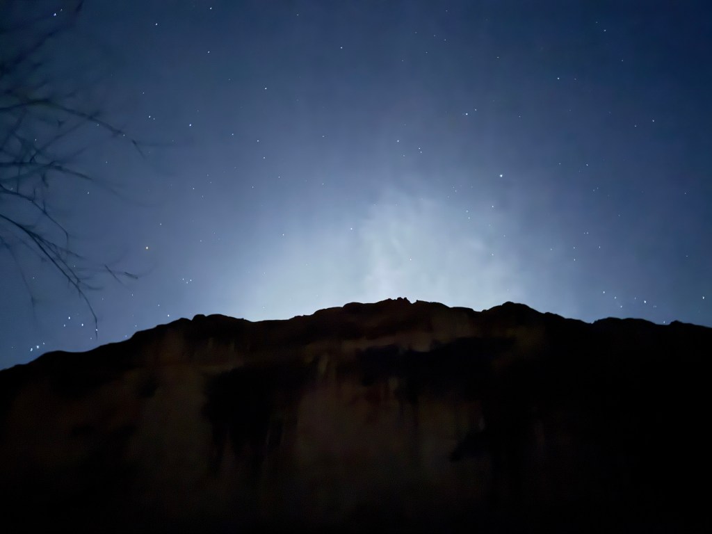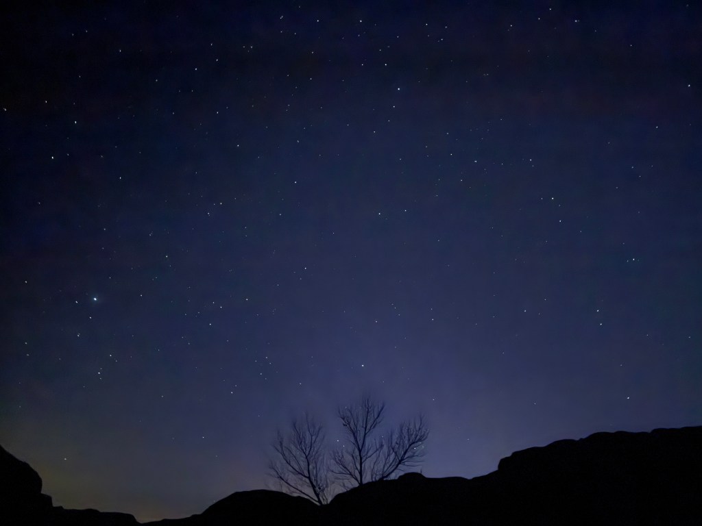 Our campsite views are lovely and we are tucked in for the evening. The sky has clouded over, so no starry photos.