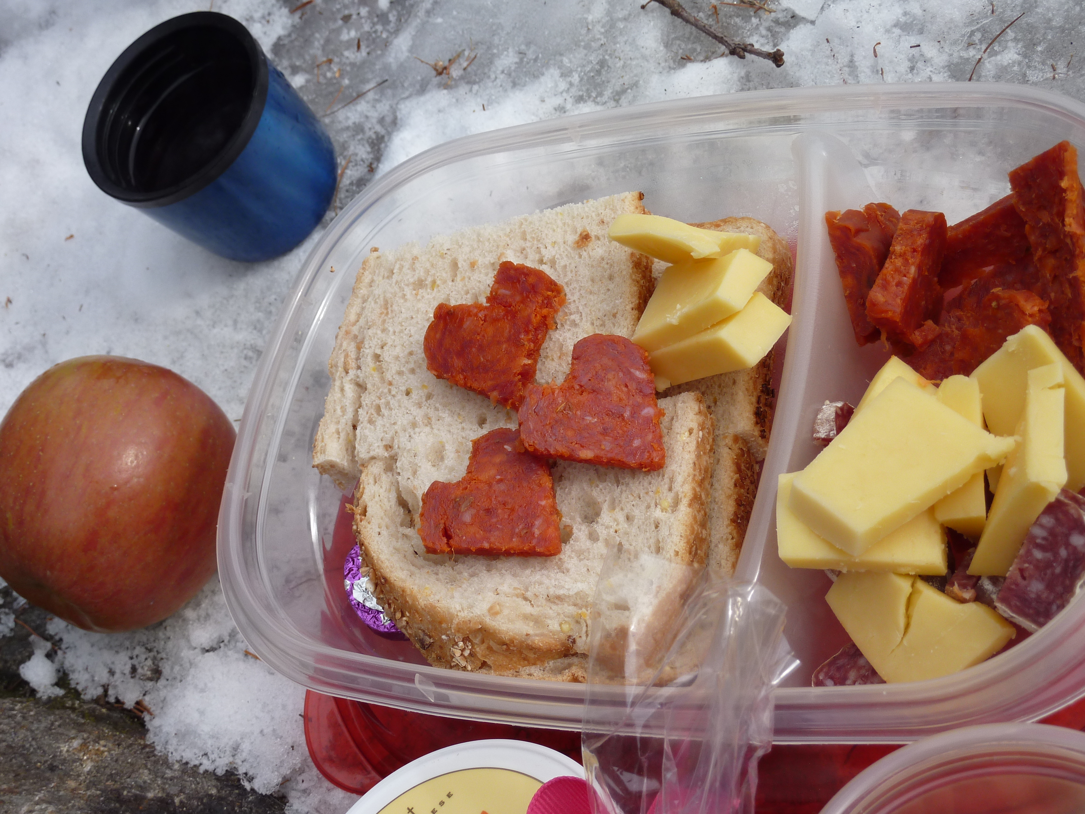 Pepperoni or a sausage is great protein source and makes for a fun treat when your husband decides to cut it in cute shapes to celebrate a special day. Can you guess what day we were hiking on?
