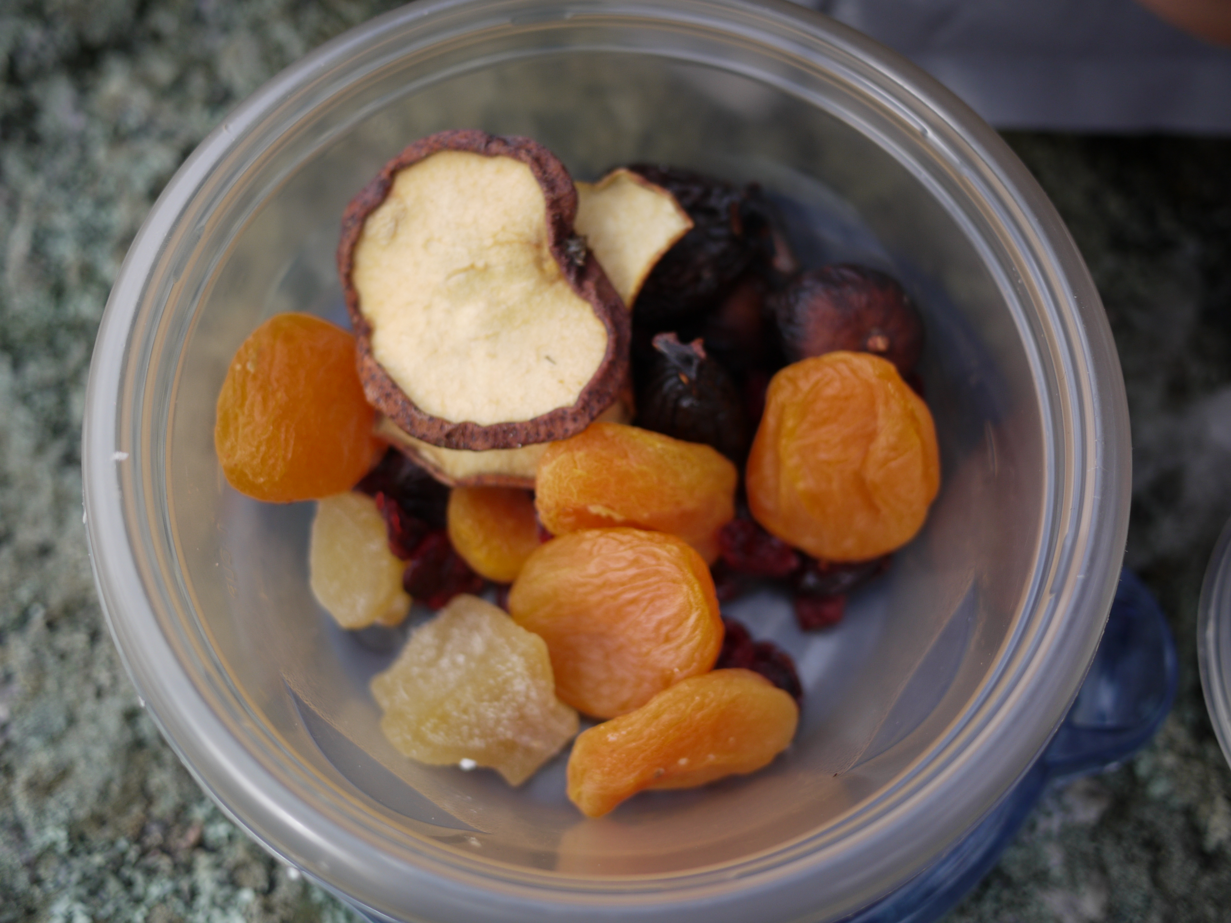 This combination is dried apricots, uncrystallized ginger, dried pears, figs and cranberries. So refreshing.
