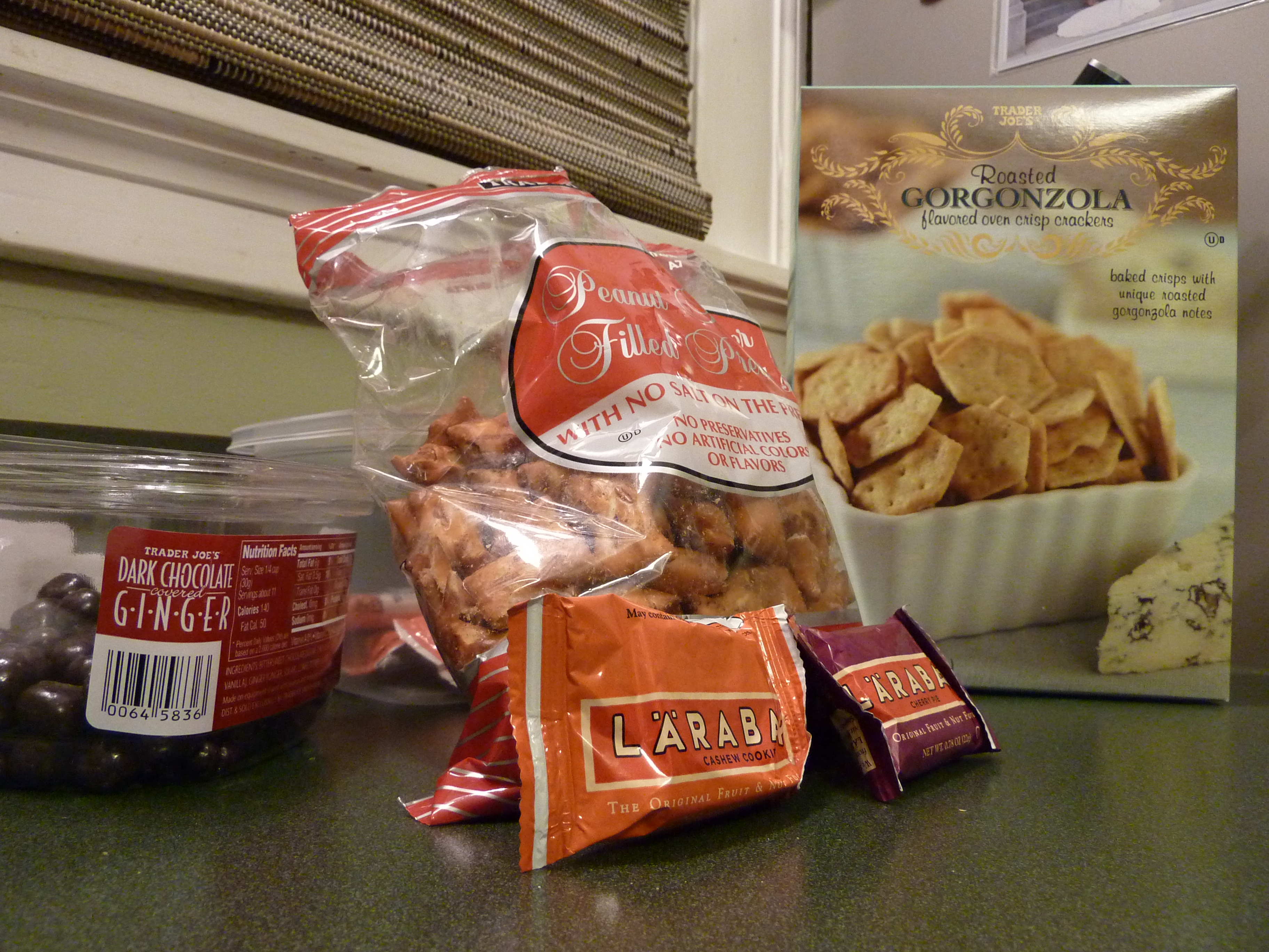 These Trader Joes Gorgonzola cheese crackers are so tasty and if you slap a little goat cheese on top, pure heaven. For a chocolate pick up I highly recommend Trader Joes dark chocolate covered ginger, what a zing!! Mike is a pretzel junkie and when it is filled with peanut butter he gets in the zone. As for the bars, I’ll cover those in another post.